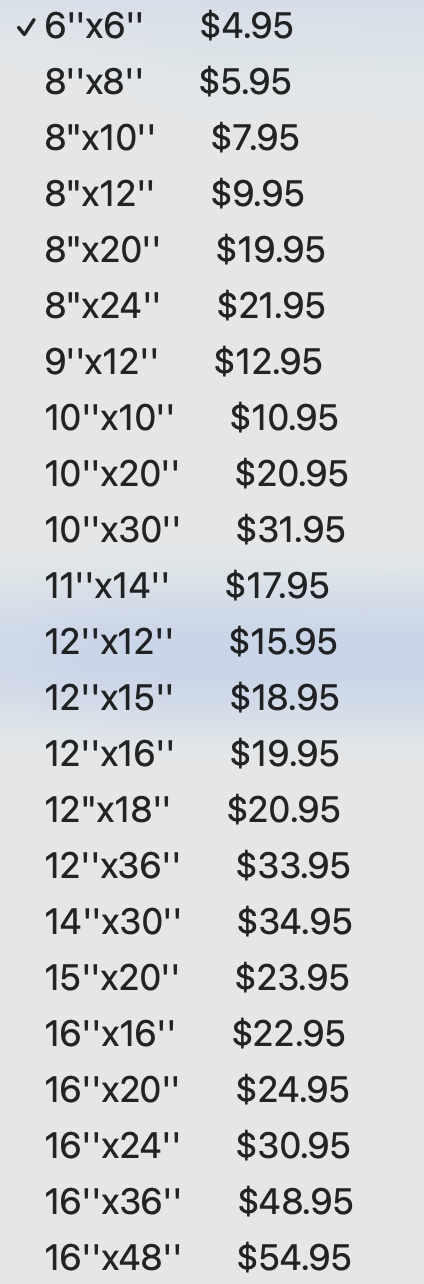 To PurchaseContactncapra123@gmail.com I use ProPrints to make canvas wraps of my images.Prices and sizing below. $50 Artist Fee+Tax and Shipping+Size (see charts)